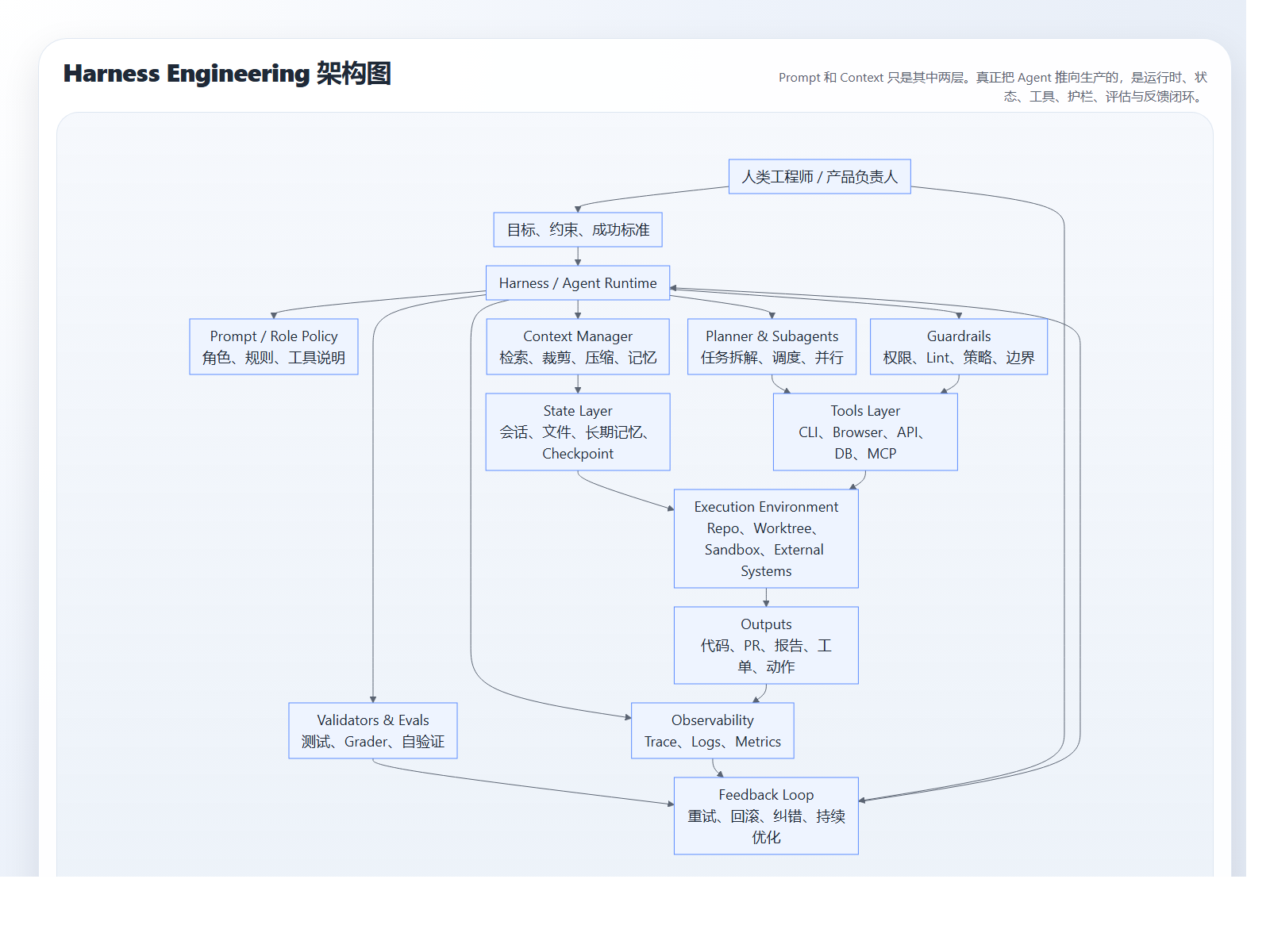 也正因如此,我更倾向于把 Harness Engineering 理解为一个总括性词:它涵盖了让 agent 运行起来的系统设计,也涵盖了让它能被评估和迭代的反馈回路。